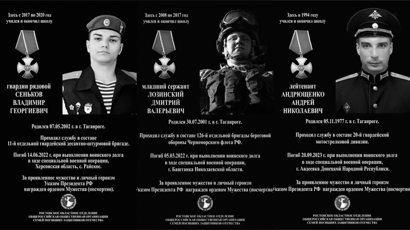 28 ноября решениями городской Думы Таганрога согласована установка трёх мемориальных досок, посвящённых памяти Владимира Сенькова, Андрея Андрющенко и Дмитрия Лозинского, погибших при исполнении воинского долга в ходе специальной военной операции. Все трое – уроженцы Таганрога, за проявленное мужество и личный героизм награждённые орденами Мужества (посмертно). Мемориальная доска гвардии рядовому Владимиру Сенькову будет установлена на фасаде школы № 16 (площадь Мира, 6а), которую он окончил в 2020 году. Проходил службу в составе 11-й отдельной гвардейской десантно-штурмовой бригады. Погиб в июне 2022 года в селе Райском Херсонской области. Младший сержант Дмитрий Лозинский воевал в рядах 126-й отдельной бригады береговой обороны Черноморского флота РФ. Погиб в марте 2022 года в городе Баштанке Николаевской области. Мемориальная доска будет установлена на фасаде таганрогской школы № 5 (ул. Сергея Шило, 162), в которой Дмитрий учился с 2008 по 2017 годы. В сентябре 2023 года в боях за г