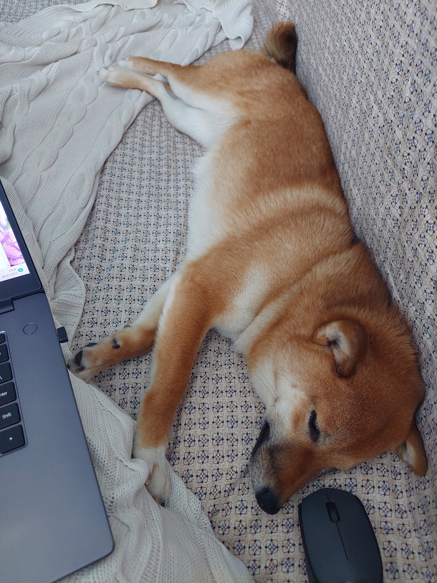 Занимаемся на курсе по не подбору с земли мы уже четыре недели. За это время выучили кучу новых полезных команд: плюнь, дай, фу, не бери. Вспомнили выдержку перед едой и прокачали самоконтроль - теперь можно поставить миску, сказать "не бери" и выйти из комнаты, миска останется не тронутой. Научились держать себя в лапах в моменты когда еда падает с неба или летит мимо носа. Этот навык в дальнейшем тренировать не планирую - мы с Дайки, наоборот, учились догонять кусочки и ловить на лету в рамках развития пищевой мотивации. Но пока занимаем и прокачиваем самоконтроль - эти упражнения тоже очень помогают. А еще Дайки теперь умеет не хватать всё, что плохо лежит на полу. И мы, наконец-то, сдали тесты и смогли перейти тренироваться на улицу. Внезапный побочный эффект от ежедневных новых тренировок - у Дайки активировалась опция "совместный сон с хозяевами". Если раньше она изредка приходила полежать рядом утром и вечером на несколько минут, то теперь рыжая девушка укладывается спать под бо