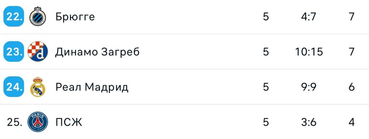 «Реал» и «ПСЖ» идут ниже загребского «Динамо» в таблице ЛЧ – хорваты проиграли 2:9 «Баварии» на старте турнира: также выше мадридцев и парижан идут «Брюгге», «Селтик», «Брест». До конца общего этапа ЛЧ осталось всего три тура – в плей-офф выйдут только топ-24 клуба таблицы, остальные вылетят