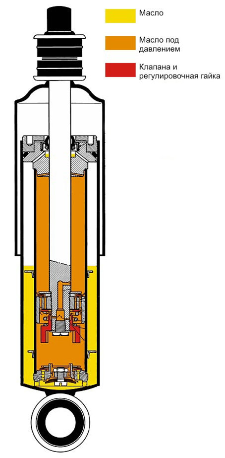 недостатки: возможность перегрева жидкости и потеря эффективности при экстремальных нагрузках, но это частично компенсируется в газомасляных амортизаторах, газ позволяет сохранить характеристики амортизатора при достаточно высоких температурах, при интенсивной работе амортизатор может нагреваться до температур +100 С.