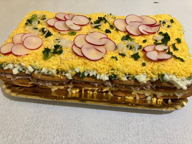 ☝️ Вы можете использовать только один тип сыра или несколько разных, например Гауда + Янтарь. Общий вес остается прежним, то есть 150 грамм. Вы можете разнообразить вкус этого слоя начинки, добавив, например, консервированную кукурузу или / и мелко нарезанные ломтики ветчины. Выберите плоскую тарелку, на которую поместится весь салат. Выложите на него первый слой крекеров. Я делаю так - 3 крекера, прилегающие друг к другу. Аккуратно выложите на них первый слой тертого сыра и майонеза. Я рекомендую сначала положить немного начинки на стыки, чтобы крекеры не расходились. Последовательно покройте начинкой всю поверхность крекеров. Для первого слоя с сырной начи