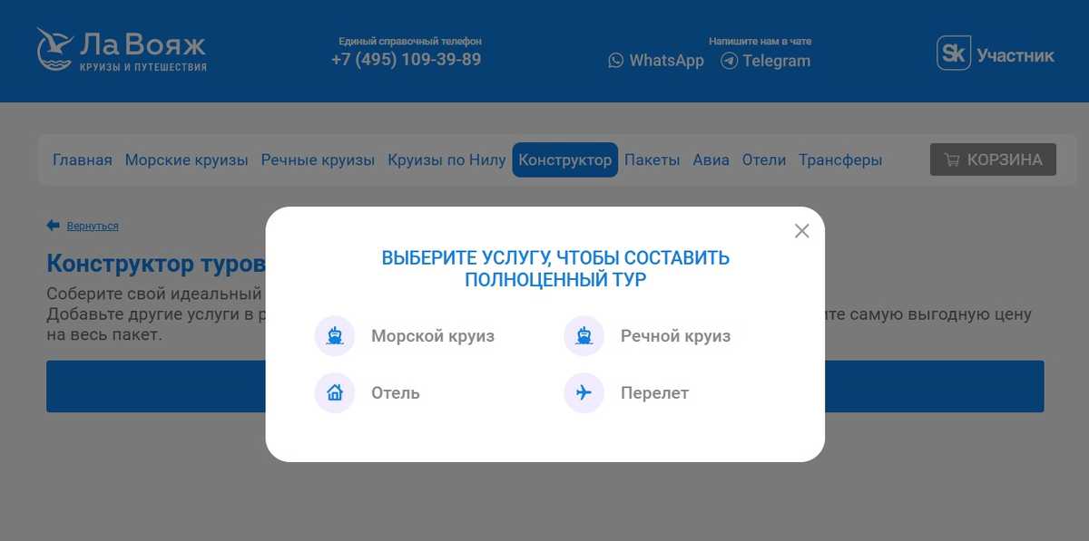 Найти готовый идеальный вариант отдыха, который соответствовал бы всем заданным параметрам и “хочу” может стать сложной задачей. Но “Миссия выполнима”, если вы сами создадите путешествие мечты с помощью уникального инструмента — онлайн сервиса «Конструктор туров», который позволит вам создать любой многокомпонентный тур всего за пару минут. Расскажем подробнее об этом умном и удобном онлайн-сервисе и его преимуществах. Это онлайн-сервис, с помощью которого вы самостоятельно собираете путешествие, выбирая только те услуги, которые вам действительно нужны. - Забронировать морской или речной круиз. Например, отправиться в круиз из Шанхая в Японию на лайнере Spectrum of the Seas, вернуться в Шанхай и продолжить путешествие в круизе по реке Янцзы; - Добавить отель, который соответствует вашим требованиям; - Подобрать удобные перелёты; - Заказать трансфер для комфортного передвижения. Всё очень просто и интуитивно понятно: 1. Перейдите в раздел «Конструктор туров» https://lavoyage.ru/constru
