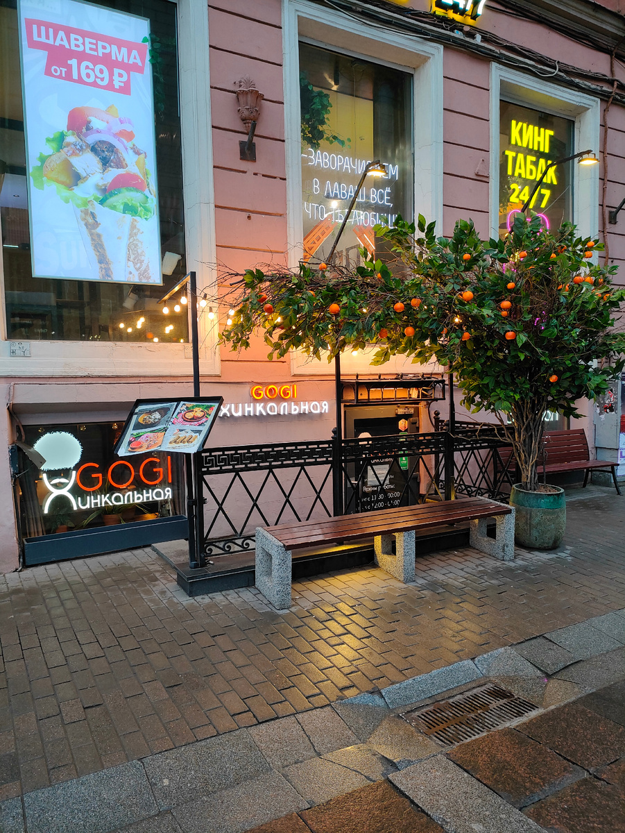 Сегодня опять была грузинская кухня. Просто надо было пообедать перед поездом, а в моём списке это заведение было ближе всего. И сейчас я скажу крамольную вещь, но...Гоги мне зашло больше, чем Маруся и Ко. Кроме интерьера, в Марусе он более элегантный. Вот такие дела. Брала харчо. Вкусно, по специям ни чего добавить не прибавить. Пять. Запечённые овощи (баклажан , перец, помидор) начиненные грибами и сыром. В начале показалось пресно. Но когда перемешала с "соком" от сыра, прям то что нужно. Пять. С собой на ужин взяла рулетики из баклажан. Сейчас специально один попробовала. Остренький, но в меру, сыр с орехами как раз в идиальной пропорции. Пять. Итог. Да вот явно буду в Питере - зайду. Кухня понравилась, цены - нормальные. Расположение - аккурат напротив Дома купцов Елисеевых. А что ещё туристу надо? https://khinkalnayagogi.com/ А на этом всё. Спасибо всем, кто был со мной. Видео из магазина купцов Елисеевых попытаюсь загрузить , но поезд накладывает свои реали.