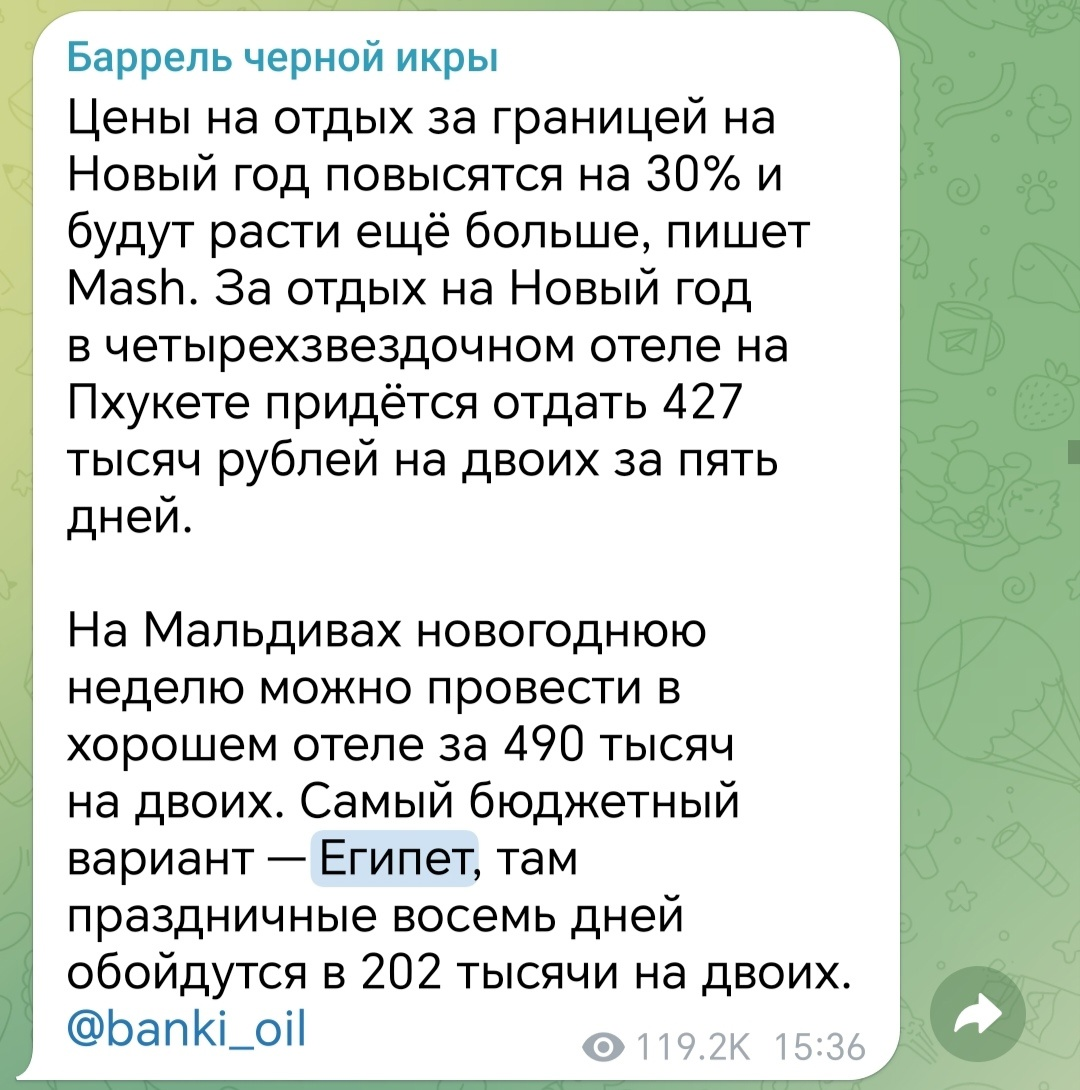 Перед Новым годом социальные сети проводят опросы: как отмечать будете? Я помню, какие ответы давали граждане еще 10 лет назад: в кафе, дома, с семьей. Теперь все изменилось. Пять главных новогодних направлений: Тайланд, Мальдивы, Египет, ОАЭ и Турция. Почему дома не сидится? Для кого тратятся миллионы, чтобы украсить улицы к празднику? Для кого завозятся красивые платья и туфли в магазины? Для кого в новогоднюю ночь будут работать официанты и музыканты? А это все неинтересно уже. Инфляции подвержены не только товары и услуги, но и наше ощущения счастья. Чтобы порадоваться раньше достаточно было каких-то деликатесов припасти и собраться веселой компанией. А теперь, чтобы ощутить тот же подъем энергии, нужно как минимум миллион рублей потратить. В той стране, где ты ни разу не был. Но... И это, как выяснилось, не гарантия. Сегодня в СМИ пишут про россиян, которые объявили голодовку на круизном лайнере: им обещали 15 высадок на сушу, а реализовали всего 3 (из-за поломки лайнера)