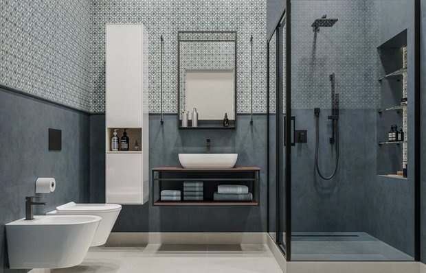 В этом проекте для фоновой отделки выбрали керамогранит темно-синий матовый для стен и светло-серый матовый для пола. Плитка с фактурой бетона сочетает высокую прочность, износостойкость и визуальную эстетику. Она подчеркивает индивидуальность и характер помещения. А узорчатая мозаика из той же серии делает интерьер динамичным и выразительным.