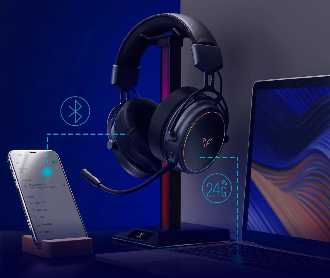 За звук в Rapoo VH800 отвечают 40-миллиметровые графеновые драйверы, а подключение к источнику сигнала может осуществляться через Bluetooth 5.2 или комплектный “свисток” по 2,4 ГГц. Само собой, с ПК лучше использовать наушники через 2,4 ГГц, что позволит им работать без задержек. Bluetooth, в свою очередь, позволяет использовать VH800 в паре со смартфоном для прослушивания музыки в дороге.