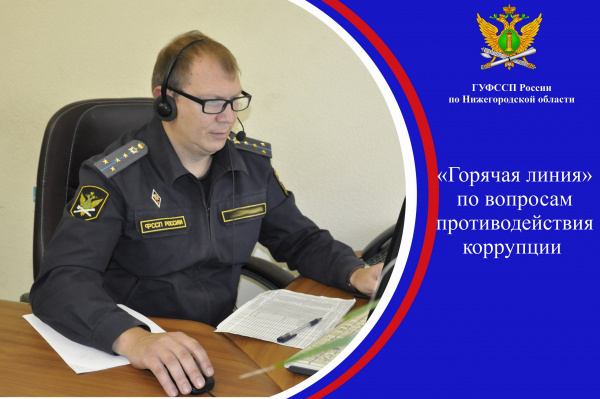 5 декабря с 10.00 до 12.00 в Главном управлении Федеральной службы судебных приставов по Нижегородской области состоится «горячая линия» по вопросам противодействия коррупции. В рамках проведения мероприятия граждане могут позвонить в отдел собственной безопасности Главного управления по вопросам, относящимся к теме антикоррупционного законодательства по телефону: 223-29-90.
