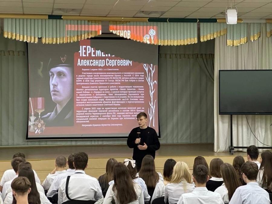 Урок был посвящён героям, отдавшим жизнь за свободу и независимость нашей Родины в разные периоды её истории. Школьники узнали о жизненном пути и подвигах пионеров и комсомольцев героев, таких как, Зоя Космодемьянская, Зина Портнова, члены подпольной антифашистской комсомольской организации «Молодая гвардия». Так же ребята узнали биографии комсомольцев, погибших на фронтах Специальной Военной Операции: Александре Черемёнове и Дмитрие Ежове.