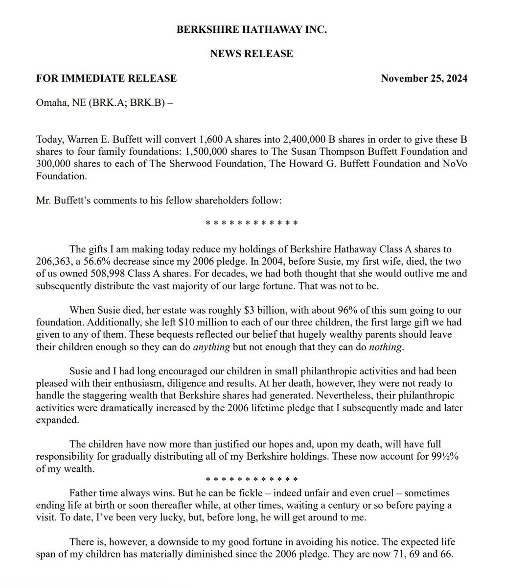 В понедельник вышло письмо Баффетта акционерам Berkshire Hathaway. Я отложил его в закладки и отправился работать, сейчас вернулся и прям тоскливо стало. Фактически, это краткая публичная версия завещания Выложу оригинал, а в комментариях машинный перевод от гугла Если коротко, он уже сейчас распределяет 50% своего состояния между рядом семейных благотворительных фондов. И много рефлексирует Рефлексирует о покойной первой супруге, ведь они ожидали, что она проживет больше Уоррена, но случилось обратное. И о том, что она завещала их детям ровно столько денег, чтобы они могли заниматься чем захотят, но не столько, чтобы они могли вообще ничего не делать. Частая формулировка среди крайне состоятельных людей, я слышал/читал что-то подобное в целом ряде интервью. «Я никогда не хотел создать династию» — продолжает Уоррен Баффетт и всячески рассуждает о том, что его дети очень хорошо проявили себя в благотворительных делах, и они готовы распорядиться и пожертвовать его деньги. Но оставляет и