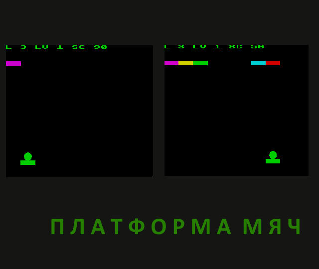 Платформа Мяч – игра про кидание мячика в стенку. Такое веселое занятие. В стиле полного ретро. То есть, как бы, примерно, как в стиле ЭВМ 80ых годом. Примерно. То есть, все запускается на современных системах. Такая стилизация под ретро. И, так ты кидаешь мячик в кирпичики. И получаешь за это очки. Надо ловить мяч обратно. Тоже важное дело! И, вот, к игрушке подготовлены рисунки. Арты. Они, как бы, сделаны по игровым экранам из игры. Но, чуть модифицированы. Чтобы на картинке лучше смотрелось. Волшебные 80ые. Компьютеры со специфической графикой. Более, как бы, из примитивов все сделано. Из линий, кубиков, квадратиков. Кружок – это, тоже, отдельная и сложная фигура, кстати. И, еще, на выбор несколько цветов. С этим и приходится иметь дело в этой игре. Помню, что некоторые старые компьютеры, еще, жужжат, как холодильник. Типа, как у меня, был 486Dx2. Он такой здоровой в корпусе и еще жужжит. Или вспоминается зелёное свечение монитора КУВТ2 (Эм Эс Экс 2). Такой монитор зелёного цвета. И
