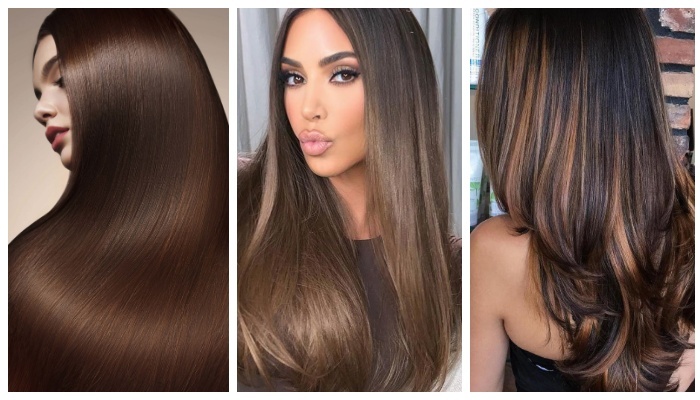 Насыщенный шоколадно-каштановый восхитителен на гладких прямых длинных волосах. Переливы смягчают черты лица, делая его более открытым.