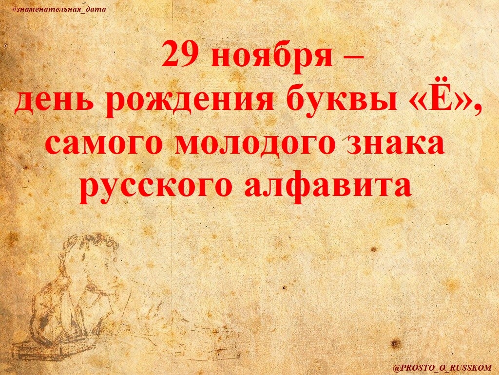 Существует интересная версия, что буква Ё появилась в русском языке в конце XVIII века благодаря княгине Екатерине Дашковой, близкой подруге Екатерины II. В этот день 1783 года в доме директора Петербургской академии наук состоялось одно из первых заседаний русских академиков. Среди прочего учёные обсуждали актуальные вопросы русской словесности. В конце собрания княгиня задала неожиданный вопрос: как, по мнению учёных, нужно писать слово «ёлка»? Академики задумались. Кто-то заявил, что правильно писать «юлка», другие отмечали, что верно использовать два общепринятых звука – io. В ответ на споры Екатерина Дашкова предложила заменить неестественное сочетание звуков io на ё. Конечно, её предложение поддержали и на этой торжественной ноте разошлись. Но в ближайшие 12 лет новый знак так и не появился ни в печатных изданиях, ни в письменной речи. Тогда идею посчитали блажью вельмож особы, которая изволила «глумиться» над русским языком. Первым печатным словом с буквой Ё стало местоимение «