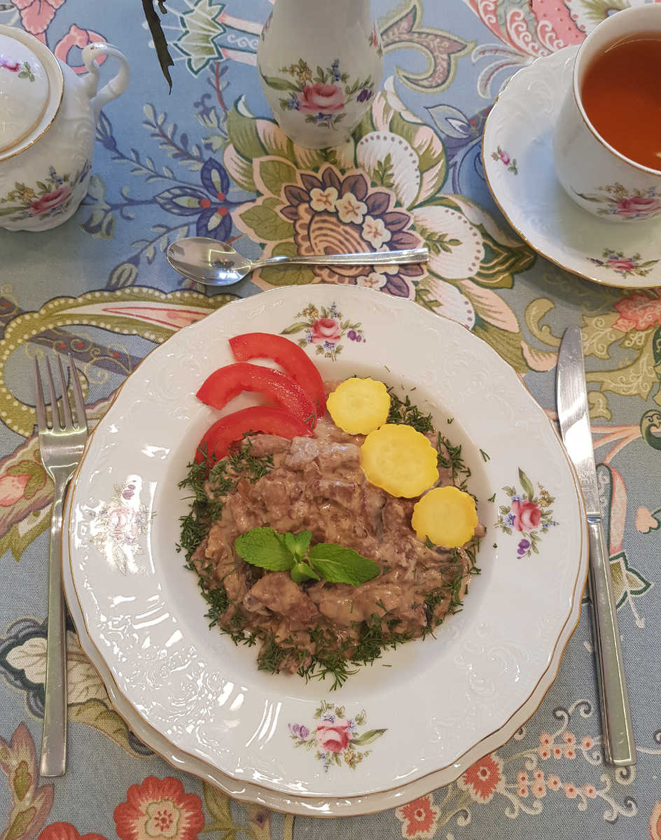 Добрый день, дорогие друзья! Сегодня я представляю вашему вниманию нежное, горячее блюдо, которое способно быстро восстановить силы и зарядить энергией. Для приготовления нам понадобятся: Говядина 800 грамм, шампиньоны 400 грамм, лук репчатый 300 грамм, сливки жирностью 33% 300 грамм, дижонская горчица 1 столовая ложка, сливочное масло 2 столовые ложки, подсолнечное масло 2 столовые ложки, сладкая паприка 1 столовая ложка, соль 3/4 чайной ложки, черный молотый перец 1/8 чайной ложки. Приготовление: Нарезать полосками мясо, удаляя прожилки. А лук нарезать крупным кубиком. На 1 столовой ложке растительного масла и 1 столовой ложки сливочного масла обжарить мясо. Жарить до степени, что бы оно только побелело, но не стоит зажаривать до золотистой корочки. Добавить лук. Добавить горчицу, соль, паприку, перец. Перемешать, накрыть крышкой, убавить огонь до среднего уровня и тушить 1,5 часа. Нарезать грибы. Выложить грибы на сковороду с разогретым растительным и сливочным маслом. Обжарит