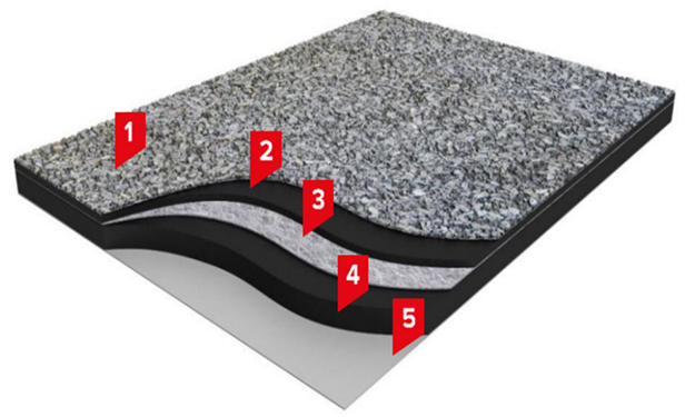 1– защитная посыпка; 2 и 4 – битумно-полимерное вяжущее; 3 – армирующая основа; 5 – нижняя защитная пленка.