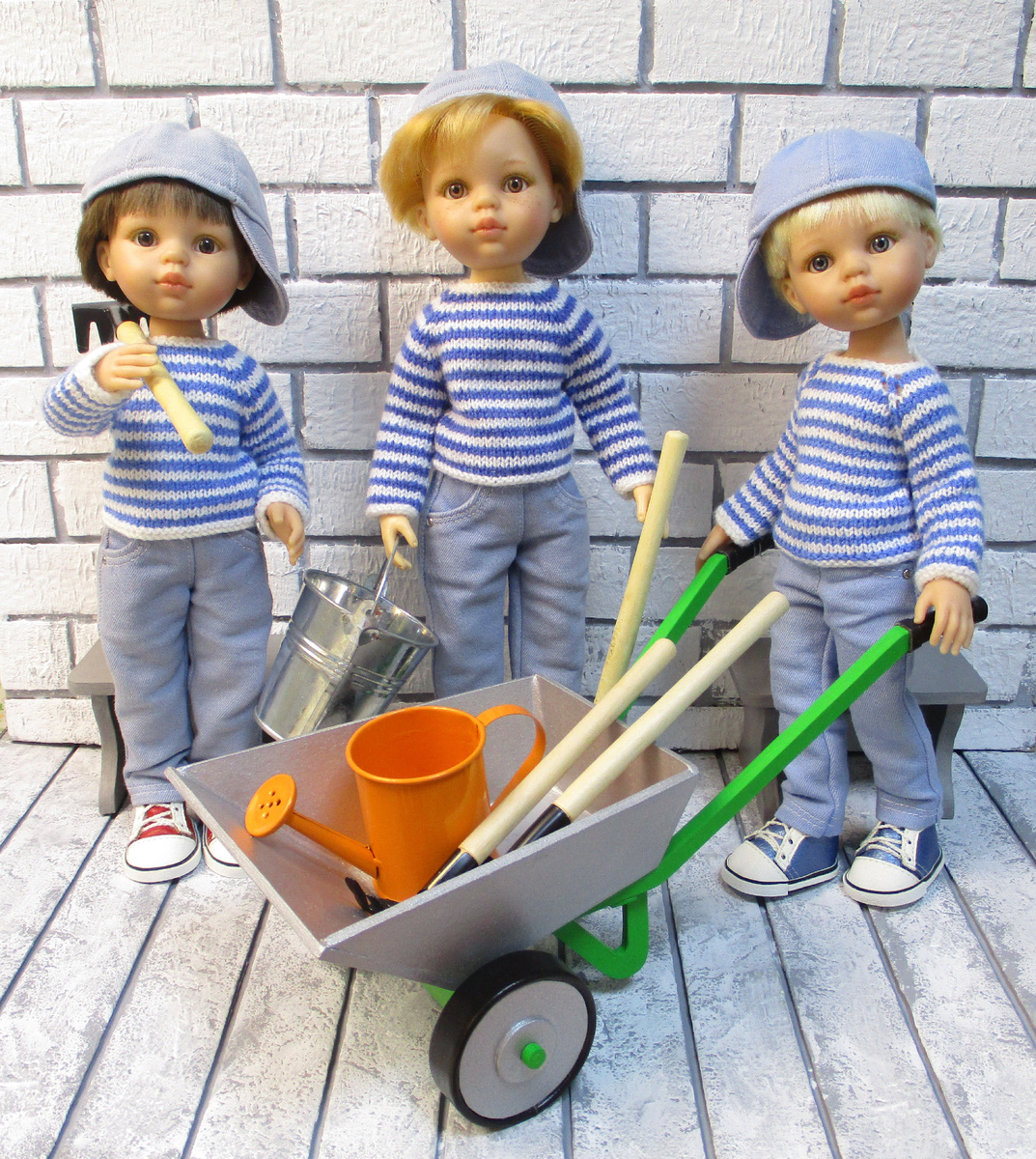 Прикупила для наших помогаторов садовый инвентарь, сделала тачку и пару маленьких скамеечек для отдыха.