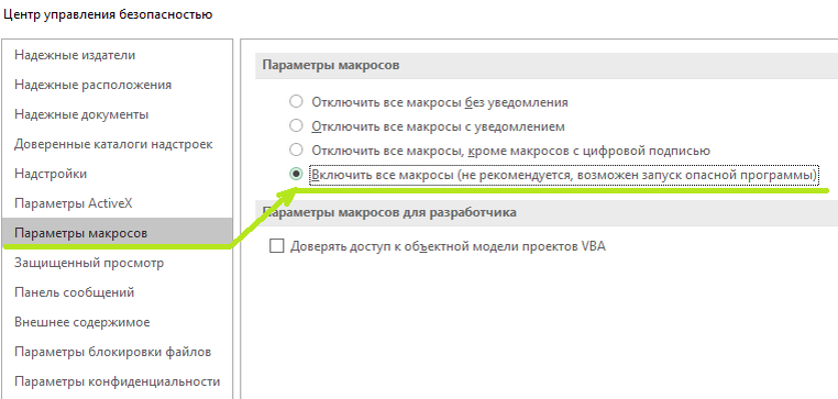 Вариант №2 - Включение макросов через Центр безопасности.