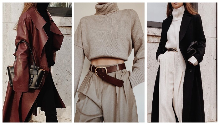 Сегодня модные гуру покажут, как собрать стильные образы на каждый день и не только из самых актуальных веей этого сезона. Продолжайте читать эту публикацию, и вам обязательно удастся получить удовольствие от прекрасного. Один из образов в серой монохромной гамме включает в себя классические брюки с защипами на талии, кожаный пояс и короткий свитер с высоким воротником. Элегантный look, в котором вы точно не замерзните, включает в себя вязаный свитер песочного цвета с высокой горловиной, бежевые брюки классического фасона, а также двустороннее пальто. Завершает данную композицию кожаная каркасная сумка. Белые брюки палаццо + белоснежный кашемировый свитер с высокой горловиной + пальто карамельного цвета + сумка из текстурированной кожи коричневого оттенка + остроносые ботильоны — образ настоящей леди, который стоит повторить в холодное время каждой моднице. Для составления невероятной красоты образов, в элегантном стиле, понадобится свитер, брюки, пальто и обувь на каблуке с острым мыс