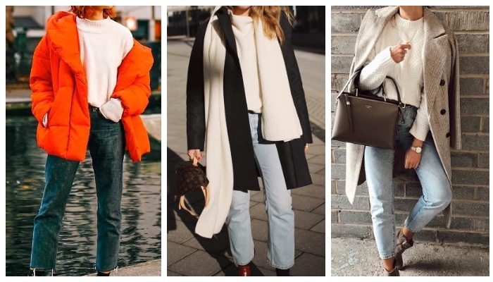 Джинсы – это одна из неотъемлемых вещей в женском гардеробе, которую мы ценим особенно высоко. Прямо сейчас стилисты продемонстрируют нам на конкретных примерах и расскажут, с чем лучше всего сочетать джинсы в холодное время года. Продолжайте оставаться с нами, впереди вас ждет множество полезной информации для поклонниц джинсов. Первый потрясающий образ включает в себя укороченные джинсы стандартного оттенка, верхнюю одежду с меховым звериным принтом и ботильоны на высоком каблуке. С этим набору отлично будут сочетаться свитер, лонгслив, худи, толстовка и водолазка. Движемся дальше, сейчас мы видим, как джинсы «бананы» классического фасона в светло-синем цвете отлично смотрятся с трендовой шубой Тедди, белоснежным вязаным свитером, остроносыми ботильонами на массивном каблуке, а также кожаным клатчем благородного шоколадного оттенка. Образ, в котором на вас будут оборачиваться, включает в себя укороченную шубу Тедди карамельного цвета, белый свитер с высокой горловиной, темные джинсы