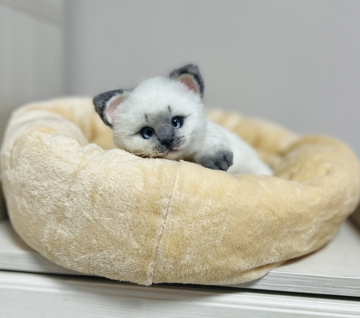 Немного информации: 20 см без хвоста, стеклянные глазки, нос и подушечки из полимерной глины, конский волос для усиков, каркас позволяющий менять положение тела, покраска акриловыми красками с помощью аэрографа... да-да, создать такого малыша целая история:)