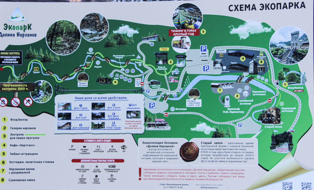 Экопарк расположен примерно в 30 километрах от Кисловодска. Место это очень интересное и не особо популярное, поэтому хочется рассказать про него подробнее. Ездили мы с семьёй в этот парк 31 декабря во время нашей новогодней поездки, о которой я писала здесь Я уже была в этом замечательном месте пару лет назад, когда ездила в долину Джилы-Су. Тогда у нас было не очень много времени и мы успели только изучить старое заброшенное здание детского лагеря, а в прошлом охотничьего домика. За те пару лет, что прошли с моего последнего визита, здесь многое изменилось. Во-первых, здесь появилась большая и удобная парковка. Во-вторых, большое количество заведений общепита. В-третьих, огромная тюбинговая горка. Именно ради неё сюда и ехали мои дети, любят они такие развлечения. Здесь есть две трассы, одна для взрослых (450 метров), другая для детей (55 метров, разделённая на пять полос). В Долину Нарзанов стоит приезжать не только ради замка и тюбинга. Также здесь можно совершить прекрасную