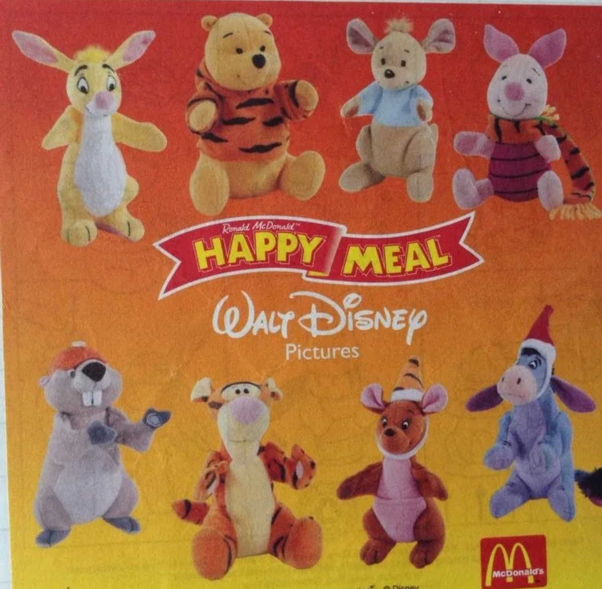 После выхода в свет полнометражного диснеевского мультфильма Винни Пух в 2000 году в McDonald's тут же появляется серия игрушек с полюбившимися всеми героями. Самой желанной игрушкой из этой серии конечно же становится главный герой Тигруля, бешеная энергия полосатого холерика не дает ни ногам, ни его друзьям покоя). Мультфильм Винни Пух 2000 выполнен в лучших диснеевских традициях, рекомендую к просмотру! В Хеппи Миле из данной серии представлено 8 плюшевых героев: 1. Кролик 2. Винни Пух 3. Крошка Ру 4. Хрюня (пяточек) 5. Бобёр (что очень странно, т.к. в мультфильме такого персонажа нет) 6. Тигруля 7. Кенга 8. Ушастик (ослик Иа) В моей коллекции из серии Винни Пух 2000 есть следующие игрушки : Другие серии посвящённые Винни Пуху: Винни Пух 2003 Винни Пух 2005 Если интересуют другие игрушки из McDonald's , то переходим на Главную страницу