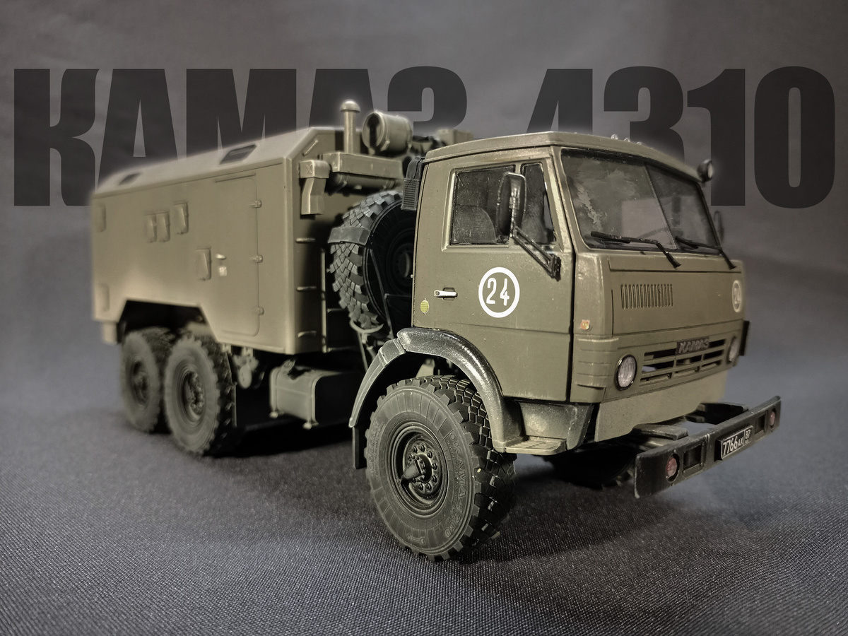 У фирмы ICM есть хорошие наборы с советскими грузовыми автомобилями Камаз-4310. Один из вариантов - бортовой - я уже публиковал ранее. А сегодняшняя заметка о втором варианте такого же трёхосного грузовика, но с кунгом вместо бортового кузова. Эту модель я собрал в феврале 2022 года. По сложности она один-в-один как и Камаз с бортовым кузовом, а если серьёзно, то сборка модели не сложная вовсе. Покрасил в военный вариант, почти ничего не добавляя из дополнительных деталей. Из добавленного: новый воздушный фильтр из смолы, вторая запаска, брезент спереди под кабиной. В компании с другими военными грузовиками смотрится отлично: Спасибо за просмотр!