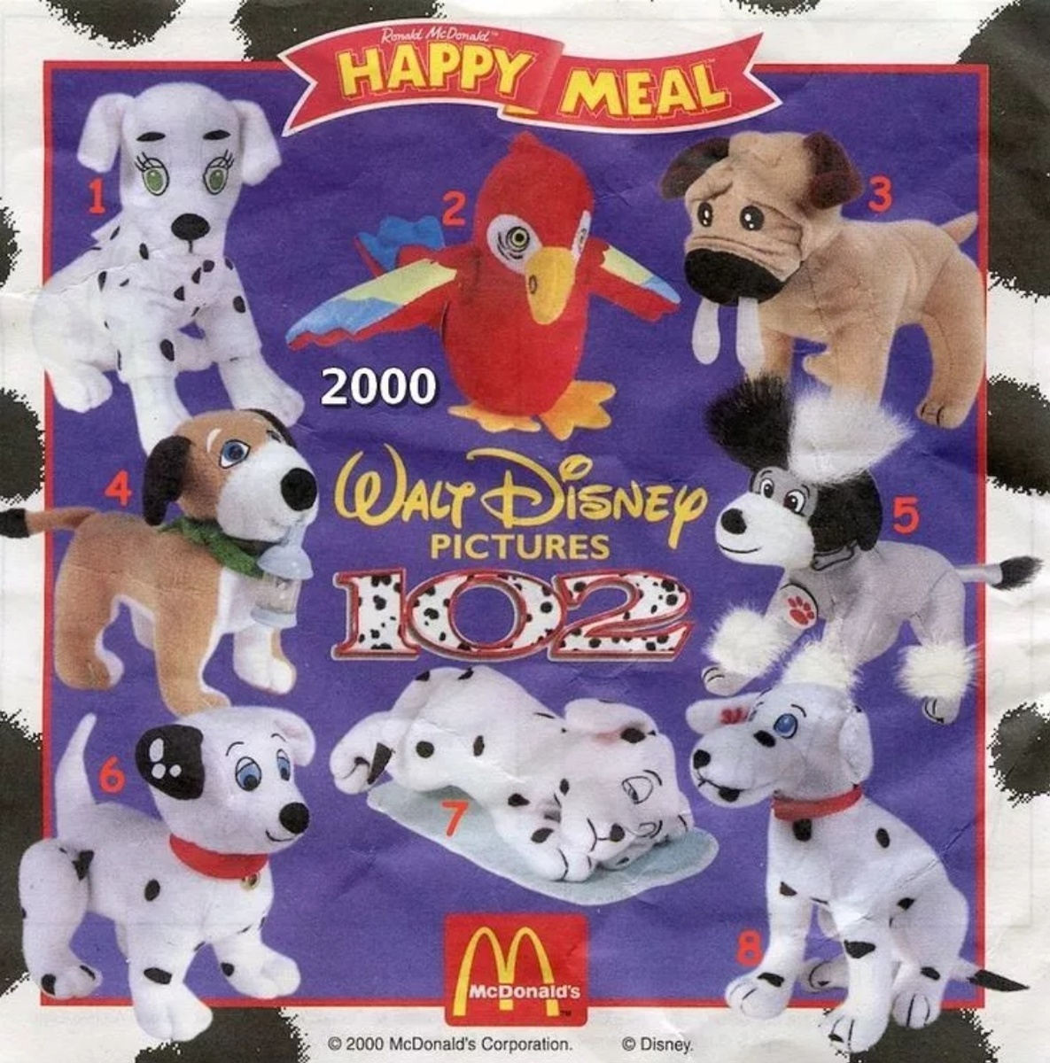 Обычно в McDonald's можно увидеть игрушки героев мультфильмов и мультсериалов. Но есть и исключения! Так фильм "102 далматинца" вышедший в свет в 2000 году стал исключением и удостоился целой серии игрушек в McDonald's. Этот факт подтверждает, что фильм действительно достоин нашего внимания. После просмотра которого, конечно же каждому захочется получить себе хотя бы одного персонажа) И так, в серии 102 далматинца 2000 из McDonald's 8 плюшевых игрушек : 1. Диковинка в кофте с пятнами (один из щенков Хвостика и Доти, без пятен) 2. Попугай Боцман 3. Друлер (слюнявый пес Кевина) 4. Чоп (маленький, мохнатый и очень кусачий пёс Кевина) 5. Пушок (пёсик Стервеллы) 6. Домино (один из щенков Хвостика и Доти) 7. Спящий Хвостик Младший (один из щенков Хвостика и Доти) 8. Хвостик В моей коллекции из этой серии есть две милые собачки: Если интересуют другие игрушки из McDonald's , то переходим на Главную страницу