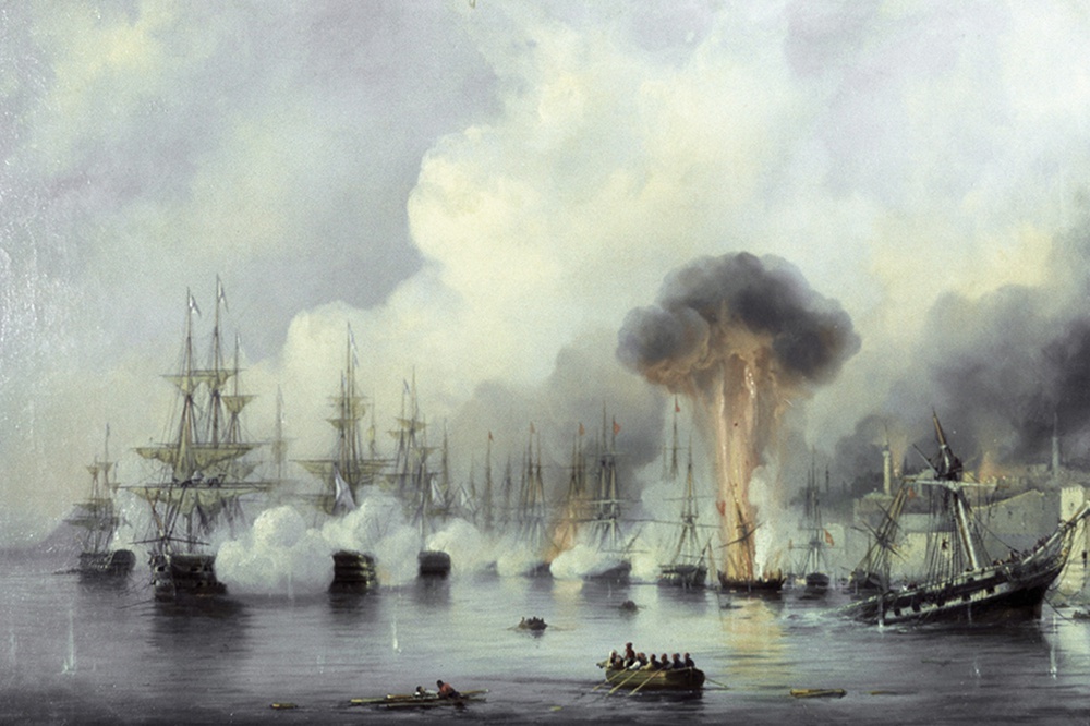 30 ноября 1853 г. во время Крымской войны 1853-1856 гг. в Синопской бухте эскадра под командованием вице-адмирала П.С. Нахимова (6 линейных кораблей и два фрегата) уничтожила 15 из 16 кораблей турецкого флота, подавив, кроме того, береговые батареи противника. В экспозиции зала № 2 истории Крымской войны и Синопского сражения посвящен значительный раздел. Среди ряда факторов, обусловивших победу эскадры П.С. Нахимова в этом бою, необходимо отметить грамотное применение корабельной артиллерии, сыгравшее решающую роль. В сражении сказался значительный численный и качественный перевес русской артиллерии — 720 пушек против 510 у турок. Во-первых, тяжелые орудия русских линейных кораблей по своей эффективности намного превосходили относительно небольшие пушки турецких фрегатов, не говоря уже о более мелких судах. Вес бортового залпа русской эскадры 400 пудов, турецкой – 150. Во-вторых, высокая скорострельность. Русская эскадра выпустила по врагу 18 тыс. снарядов, т. е. из каждого орудия д