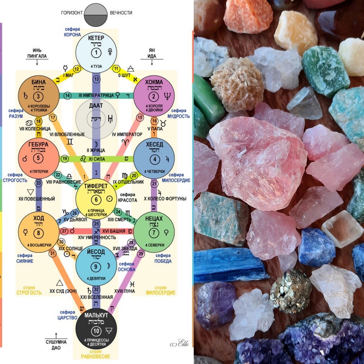 Древо Сефирот в каббале представляет собой структуру, описывающую различные аспекты мироздания и проявления Божественного света. Каждая из десяти сефирот символизирует определённые качества или энергии, связанные с аспектами духовного и материального мира. В эзотерической традиции сефирам соответствуют определённые минералы, которые, как считается, резонируют с её энергией и свойствами. 1. Кетер (Корона) • Символика: Вершина древа, высшая точка духовного осознания и источник Божественного света. Кетер олицетворяет чистый потенциал и единство. • Минералы: Алмаз (символизирует чистоту и высшее сознание), кварц (усиливает связь с высшими энергиями). • Атрибуты: Белый свет, отсутствие формы. 2. Хокма (Мудрость) • Символика: Первичный импульс творения, мужская активная энергия, чистое вдохновение. • Минералы: Сапфир (обостряет умственное восприятие), горный хрусталь (способствует интуиции). • Атрибуты: Серебряный свет, символ мужского начала. 3. Бина (Разум) • Символика: Женск