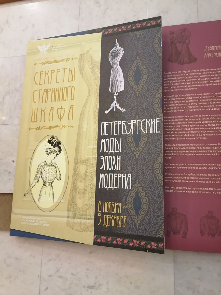 В петербургской Публичке (в Новом здании) в эти дни проходит интересная выставка, которая называется «Секреты старинного шкафа: петербургские моды эпохи модерна». 18 ноября, в день открытия, были продемонстрированы образы из коллекции стилиста, создателя театра Моды Милы Маковской, вдохновленные эпохой начала ХХ века. На церемонии открытия были также наши студенты колледжа Инженерной школы одежды Санкт-Петербургского государственного университета промышленных технологий и дизайна. Посетитель погружается в атмосферу модного Петербурга Серебряного века: мы узнаём, как работали ателье, магазины, а также модные дома, обшивавшие Императорский Двор. На выставке представлены редкие издания XIX-XX вв. из фондов РНБ. Это журналы, книги, брошюры с выкройками, а также моду времени НЭПа: «Модный свет» (СПб, 1913), «Женский журнал» (М, 1927), «Четыре сезона» (М, 1928). Особый интерес представляют такие издания, как «Искусство одеваться» Габриэля Прево (СПб, 1892) с рассуждениями о понятии мужско