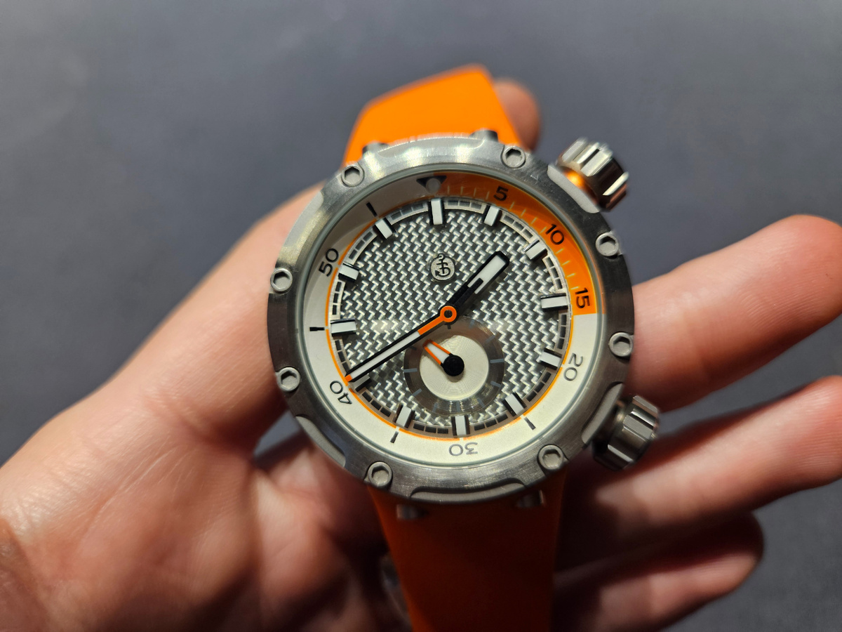 Циферблат выполнен из углеволокна, опять же отсылка на 5-ЧМ. Цвет серебристый, и фактура переливается под разными углами, играет и искрится. По внешнему радиусу идет внутренний рант белого цвета, с ярким оранжевым сектором. Часовые индексы и стрелки заполнены суперлминовой, и очень ярко светятся.