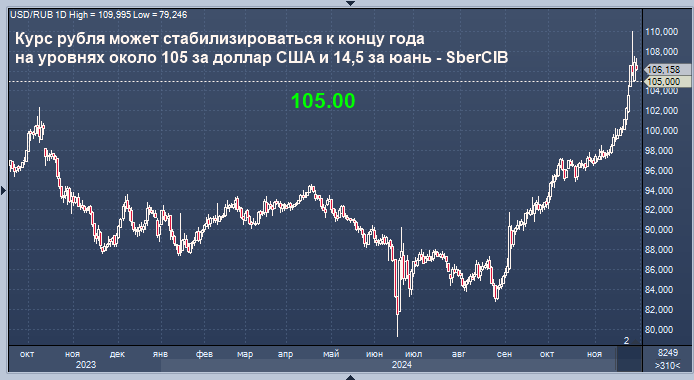 Курс рубля может стабилизироваться к концу года на уровнях около 105 за доллар США и 14,5 за юань - SberCIB Курс доллара к рублю расчётный, фьючерс, вечный фьючерс и межбанк. Курс евро к рублю расчётный, фьючерс, вечный фьючерс и межбанк. Курс юаня к рублю биржевой, фьючерс, вечный фьючерс и межбанк. Курс рубля может стабилизироваться к концу года на уровнях около 105 за доллар США и 14,5 за юань, полагают аналитики SberCIB Investment Research. Способствовать ослаблению рубля, на их взгляд, будут следующие факторы: Это может произойти из-за уменьшения поставок российского газа в Европу, действий будущей администрации США и роста дисконтов на российские экспортные товары. Аналитики ждут большего глобального укрепления доллара из-за рисков замедления экономического роста в ЕС и Китае на фоне повышения американских пошлин. В SberCIB считают, что до конца года рубль стабилизируется из-за роста продаж валюты ЦБ - на уровнях около 105 за доллар и 14,5 - за юань. Однако к концу следующего год