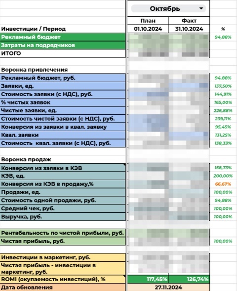 Также 2 раза в неделю мы предоставляем отчетность клиенту по основным показателям: потраченный бюджет, стоимость уникально-целевой заявки, смотрим динамику по квалам, КЭВам и продажам через аналитику.