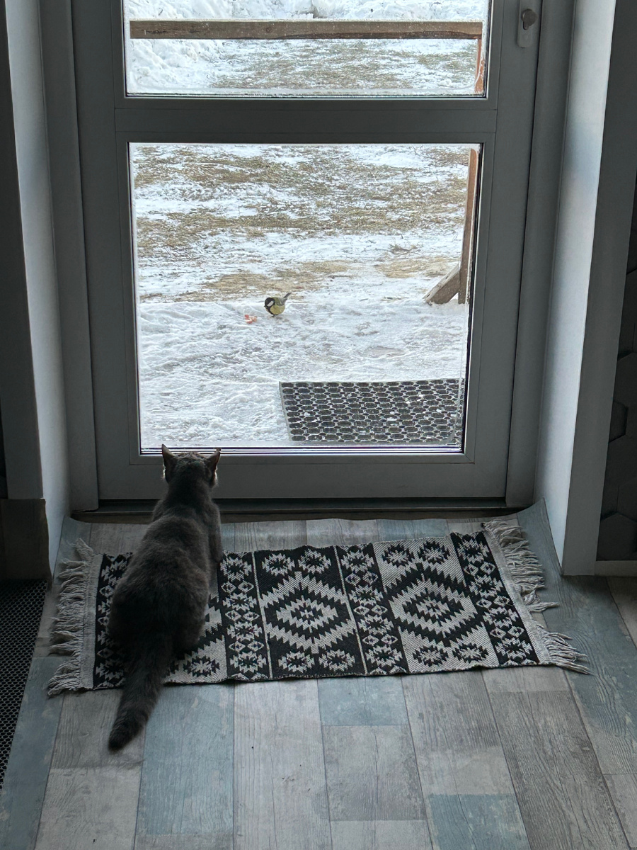 Котик Тоша не оставляет попытки поймать синиц. Вот только постоянно натыкается на коварное стекло. А синицы-то какие вредные! Стащили из кормушки сало и прямо перед котом трапезничали. На фото ниже можно увидеть глубокую кошачью грусть.