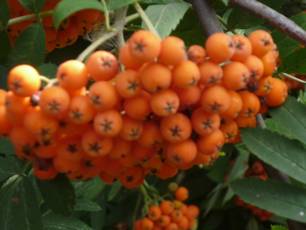 В мае очень буйно цвела рябина. Жалею, что за всеми хлопотами так и не собралась ее сфотографировать. Она была словно в кремовое платье одета. А к концу лета папино дерево украсили крупные оранжевые гроздья. Любовалась я на эту красоту и вспоминались мне строки Есенина: «В саду горит огонь рябины красной…»