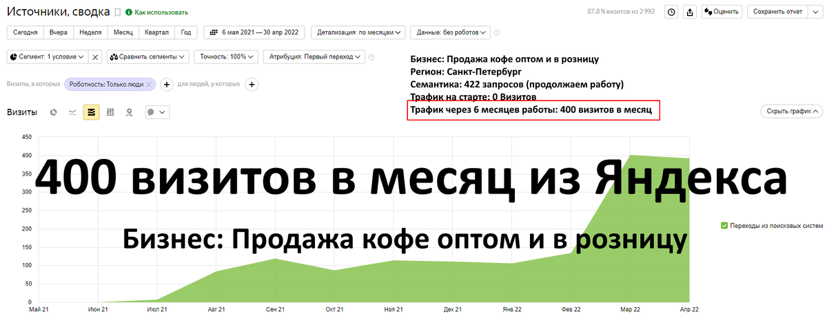 Бизнес: Продажа кофе оптом и розницу Регион: Санкт-Петербург Семантика: 422 запроса (продолжаем дальше расширять) Трафик на старте: 0 человек Через 6 месяцев работы: Подняли до 400 человек в месяц