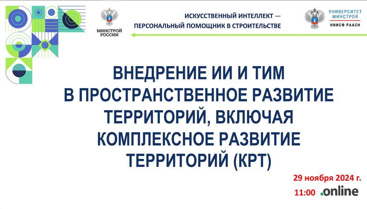 Вебинар. Внедрение ИИ и ТИМ в пространственное развитие территорий, включая комплексное развитие территорий (КРТ) Вебинар проводится в рамках курса "Искусственный интеллект - персональный помощник в строительстве" ВИДЕО