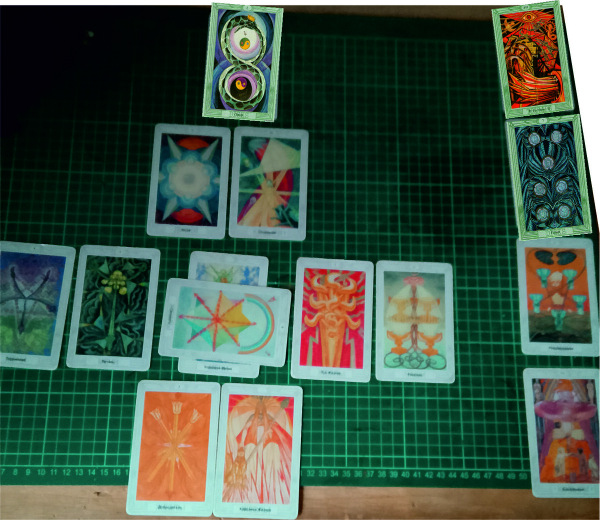 А в раскладе три карты мечей. Вы - дама ветра, роковая женщина умная и холодная, не то чтобы совсем бесчувственная, но давно знающая суть бытия. И две карты прошлого. Мысли о духовном, или обреченные на неудачу, и рождение конфликта. Вместе они создают обиду. В Вашей основе - пламя. Тройка жезлов - рождение желаний и дама жезлов - чувственные желания. Огонь - это всегда магнит, который тянет нас из болота. Ещё две карты жезлов. Вспышка, быстрая и ослепительная как молния - сегодняшний день, освещающий огнём ближайшее будущее. Что же за этим тёплым огнём? Четвёрка кубков, устойчивые чувства. Не раз и не два, со мной спорили, и доказывали, что роскошь, это здорово. Не убедили. Устойчивые чувства - предисловие падения. Всегда. Следующий ряд показывает Ваши поступки. Постоянный успех и мудрость. И корона, рассказывающая, как Вас воспринимают окружающие. Считают Вас крайне везучей особой. Единственная проблема двойки - неустойчивость. как монета упавшая на ребро. Ваше влияние на сит