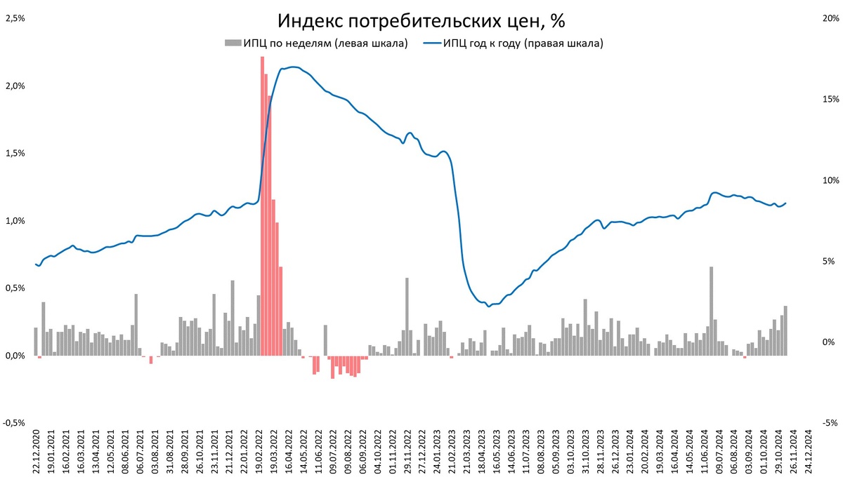Данные по недельной инфляции в очередной раз вышли безрадостные. 0,36% по сравнению с 0,37% неделей ранее едва ли можно оценить как замедление. Кроме того, цифры аналогичных периодов прошлого года оказываются ниже текущих. А на ноябрь прошлого года пришелся пик инфляции. В годовом выражении инфляция продолжила рост и стала отдаляться от прогнозного диапазона на конец года в 8-8,5%. Данные по кредитованию за октябрь вышли вполне ожидаемые после выхода ранее отчетности Сбера. Кредитование физических лиц замедляется. По потребительскому кредитованию даже наблюдалось снижение объема портфеля. Корпоративное кредитование в очередной раз показало очень высокие темпы роста. Но, вполне вероятно, что здесь мы наблюдаем примерно тот же эффект, что и в июне в ипотеке. ЦБ заявляет об ограничениях в кредитовании крупных компаний с высокой долговой нагрузкой, и некоторые стараются успеть воспользоваться имеющимися возможностями. Курс рубля к концу недели чуть стабилизировался. Но текущие его
