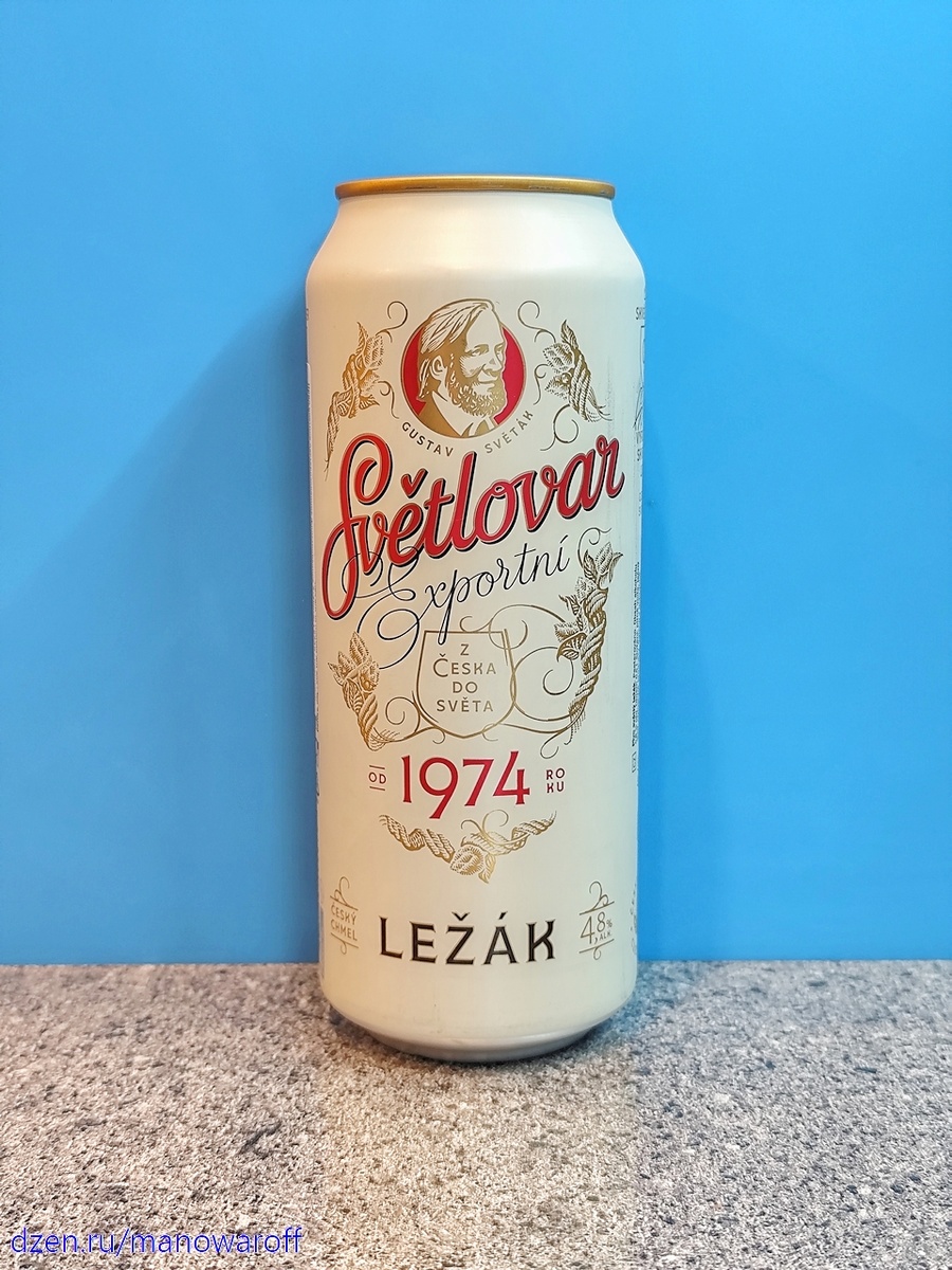 Если есть пиво под названием "Черновар", то для баланса силы должно существовать и пиво со светлой стороны. Видимо, такой логикой руководствовались на чешской пивоварне Pivovar Liberec Vratislavice, сварив пиво Svetlovar Exportni Lezak. На сайте пивоварни данное пиво отсутствует, на "тапке" описания нет, так что без ответа остается пара вопросов - что случилось в 1974 году и кто такой этот Густав, чей портрет виднеется на банке? Можно только предположить, что это пенное варится с 1974 года (а почему его к нам раньше не завозили в таком случае?), ну а Густав - это пивовар, который разработал рецептуру этого пиваса. Но подтверждения этим догадкам я в сети не нашел. Ладно, будем пробовать. На момент дегустации пиву было менее трех месяцев. Срок годности составляет год при комнатной температуре. ТТХ: *На русскоязычной бумажной нашлепке уровень алкоголя другой - 4.3%. Пиво золотисто-янтарное, прозрачное. Пены среднее количество, живет недолго. Аромат солодовый, с легкими нотками хмеля. Вкус