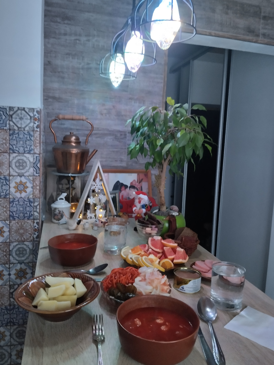Привет, друзья! Несколько дней мы с ДМ жили в городе и вот сегодня, вернулись в наш домик в деревне. На скорую руку приготовила поздний обед, а может и ранний ужин. Приготовила горячий густой суп с мясом. Купила гуляш из свинины за 140 рублей упаковку, истратила всего половину на 2 порции. Достала свои соления, отварила пару картошин, которые остались на утренние картофельнички, не добрались мы до картошки и так наелись. Мои соленья. Второй раз приготовила корейскую морковь, потому что купила специальную терку на Авито (всего за 90 рублей), прекрасно проучилась морковка и не дорого. Зимой особенно хочется цитрусовых. У меня вот такой калейдоскоп 😊 Отличный ужин получился 😊 Завтра выходной и это прекрасно- высплюсь и... поеду на работу😊 , уж очень много дел у меня скопилось и надо разобраться с бумагами и отчетами. Ваша @leila