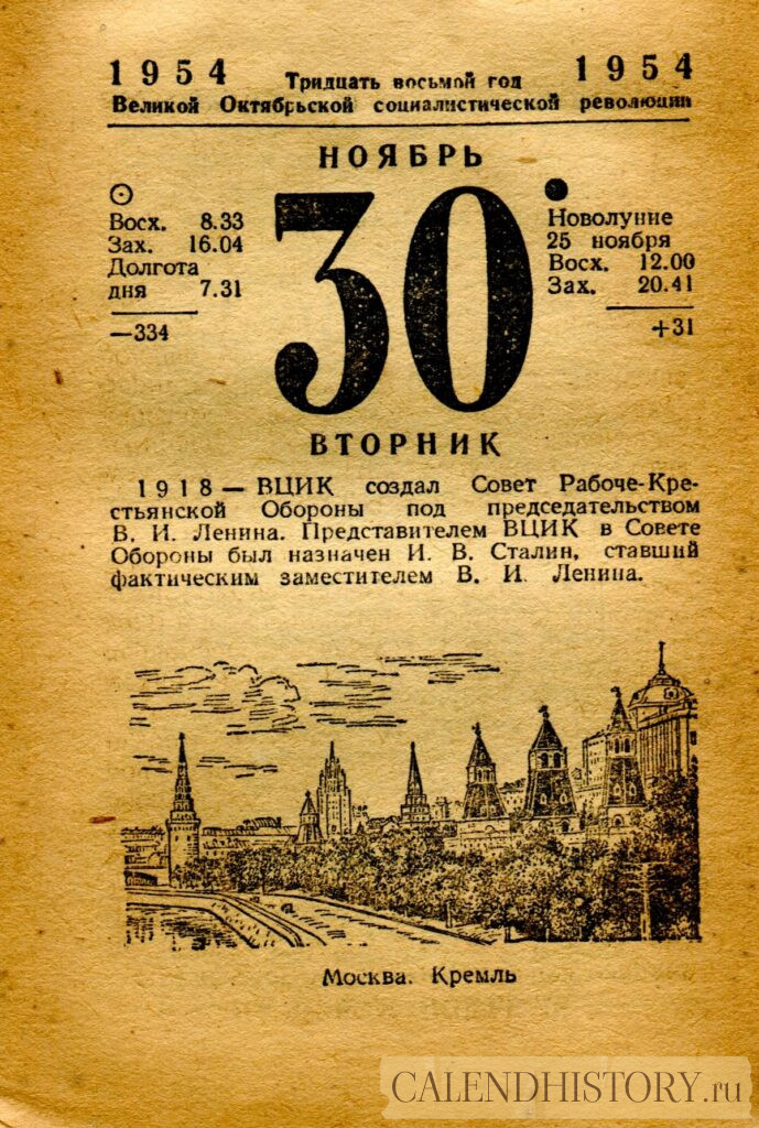 Итак, сегодня 30-го ноября и у нас на календаре 1954-й год. Перед нами листок советского календаря Политиздата. На календаре у нас вторник - 30 ноября 1954-го года. Москва. Кремль 1918 — ВЦИК создал Совет Рабоче-Крестьянской Обороны под председательством В. И. Ленина. Представителем ВЦИК в Совете Обороны был назначен И. В. Сталин, ставший фактическим заместителем В. И. Ленина. *** Оборотную сторону листка этого календаря можно посмотреть у нас по ссылке на сайте. Другие листки советских календарей смотрите у нас на сайте - CALENDHISTORY.ru ПОСМОТРИТЕ ЕЩЁ ЛИСТКИ ОТРЫВНЫХ КАЛЕНДАРЕЙ: