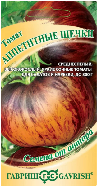 Друзья, я каждый год выращиваю много коллекционных сортов, но никогда не забываю пробовать новенькое и интересненькое от наших агрофирм. Они все стараются идти в ногу со временем и выдают порой крайне любопытные сорта. В 2024г я впервые посадила несколько сортов от Гавриш. Пока что присматриваюсь к этой агрофирме. Началось все с приятно впечатлившей меня Розовой Тюленьки. И захотелось мне посмотреть на сорта от Гавриш внимательнее. В этом году была у меня парочка Щечек от Гавриш. Про Полосатые щечки и сравнительный анализ его с Винтаж Вайн мы уже говорили недавно. Теперь посмотрим на Аппетитные Щечки. Вот так выглядел пакетик и описание сорта: Я очень люблю эффектно окрашенные сорта и, конечно, не смогла пройти мимо! Ну хорош же! В описании все почти указано верно. Куст высокий, растение индетерминантное. Плоды плоско-округлые, но много и шариков. Кисти приятного размера. Урожайность у меня была средняя, много пропусков, но потенциал высокий у сорта. На рассаду высевала его 28 марта 20