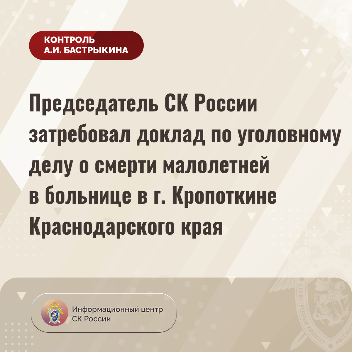 Председатель СК России затребовал доклад по уголовному делу о смерти малолетней в больнице в г. Кропоткине Краснодарского края