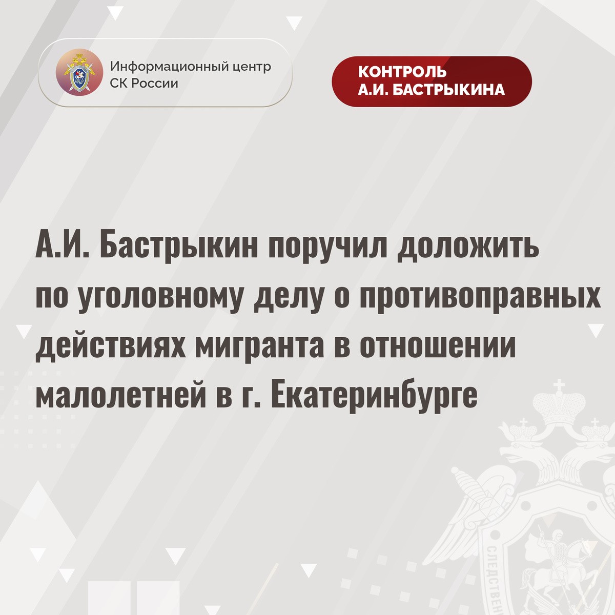 А.И. Бастрыкин поручил доложить по уголовному делу о противоправных действиях мигранта в отношении малолетней в г. Екатеринбурге