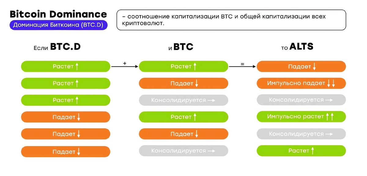 Доминация BTC (BTC.D) — это индикатор, который отражает долю BTC на криптовалютном рынке. Его движение связано с перераспределением капитала и настроениями участников. Рост BTC.D: Деньги концентрируются в BTC. Это сигнал осторожности, когда инвесторы ищут стабильность. Альткоины, как правило, теряют капитал. Снижение BTC.D: Инвесторы переходят к альткоинам. Это этап растущего доверия и повышенного риска, часто совпадающий с альтсезоном, после которого всегда следует значительная коррекция.
