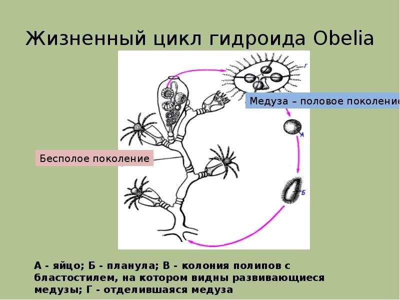 Включает примерно 9 тысяч видов водных (в основном морских) подвижных или сидячих, одиночных или коллониальных организмов. 1. Характерна лучевая (радиальная) симметрия. 2. Стенка тела образована двумя слоями клеток (энтодерма и эктодерма), разделенных неклеточной мезоглеей. 3. Имеется кишечная (гастральная) полость. 4. Характерны стрекательные клетки. 5. Размножение половое и бесполое (почкование). Для многих характерно чередование полового и бесполого размножения. 6. Нервная система диффузного типа. Тип включает в себя три класса: К. Гидроидные - пресноводные гидры, морские гидроидные полипы, медузы - сифонофоры: физалия (португальский кораблик), крестовичок. К. Сцифоидные - крупные медузы - цианея, корнерот, кубомедузы. К. Коралловые - актинии, коралловые полипы.