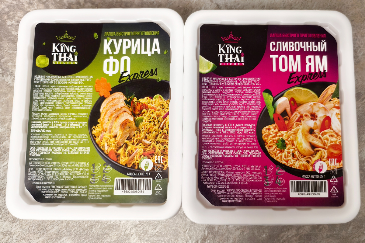 Пробую псевдотайскую лапшу King Thai. Курица Фо и Том Ям.