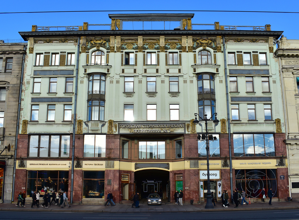 Первым зданием в стиле модерн на Невском проспекте стала постройка выдающегося петербургского архитектора Леонтия Бенуа, созданная им по заказу Московского купеческого банка. Строительство этого здания стало большим шагом для развития петербургского модерна: оно показало, что новый стиль может уживаться в петербургских классических ансамблях, не только не портя, но даже дополняя их!