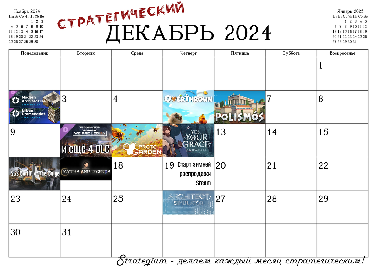 «Внезапная» новость — завтра официально начинается зима! А это означает, что пора публиковать календарь стратегических релизов на декабрь. Крупные проекты порадуют только DLC, причём рекордным станет 10 декабря — сразу 5 дополнений. 2 декабря — два набора для Cities Skylines II: Creator Pack: Modern Architecture и Creator Pack: Urban Promenades, а также радиостанция Soft Rock Radio. 5 декабря — старт раннего доступа Overthrown, градостроя с возможностью кооператива, и Cosmic Outpost — пошаговой стратегии об освоении новой планеты. 6 декабря — Polismos, ещё один античный градострой.